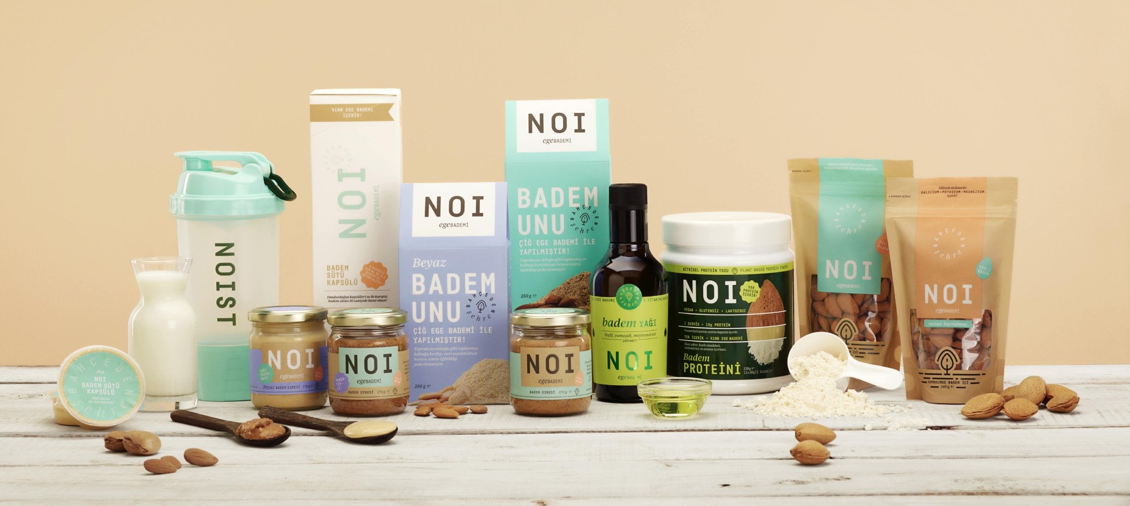 Atıksız üretimimizin bir güzel örneği, Türkiye’nin ilk ve tek badem proteini olan Noi Badem Protein Tozu. Noi Badem Protein Tozu aynı zamanda içeriğinde sadece tek bir malzeme olan, aroma, koruyucu içermeyen bir bitkisel protein tozu da diyebiliriz. Noi Badem Protein Tozunu hazırlarken bademlerin soyduğumuz zarını çifliğimizdeki dostlarımıza yem olarak veriyoruz. Beyaz bademlerin yağını çıkarıp toz haline getiriyor, çıkardığımız yağı yemeklerinize lezzet katması için şişeliyoruz. Elimizde yüksek proteine sahip besleyici ve nefis bir toz kalıyor.